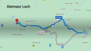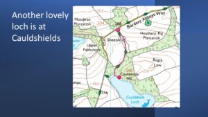 Another lovely loch is at Cauldshields but this is a 15 to 20 minute walk from where you park the car but you can paddleboard as well as swim if you can be bothered to carry everything there. The map below shows the walk from the parking area. It is slightly up hill. Again normally a quiet place to go.